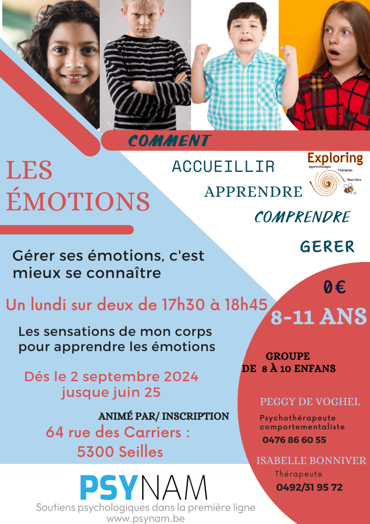 émotions au travers du jeu, du mouvement et de la parole. Ces ateliers seront encadrés par Peggy de Voghel et Isabelle Bonniver. Les ateliers se feront tout au long de l’année scolaire un lundi sur deux. Voici quelques informations et modalités pratiques afin d’organiser au mieux l’accompagnement de votre enfant.