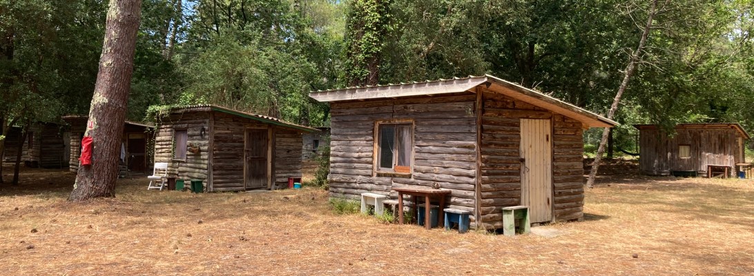 Hébergement en cabanes rustiques au cœur de la nature, avec douches et sanitaires partagés (type camping).